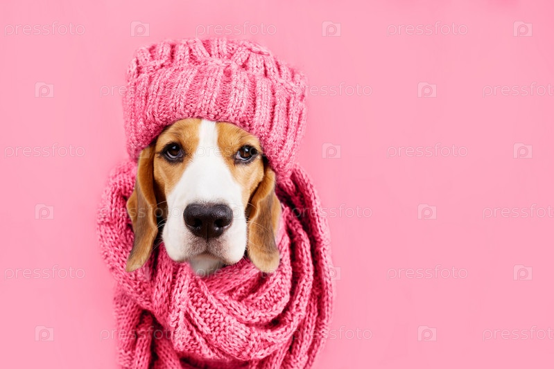 Собака-бигль в вязаном розовом шарфе или снуде и шапке