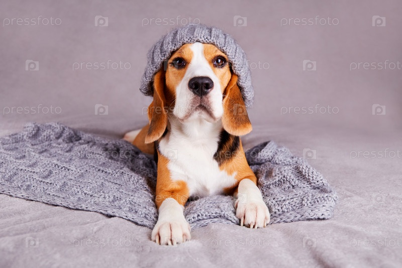 Бигль в вязаной серой шапке и шарфе лежит на диване