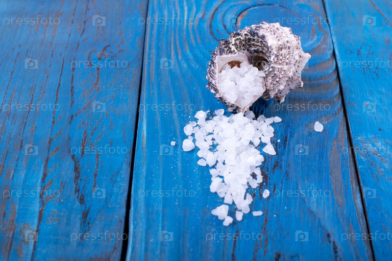 Морская соль разлетается из ракушки на синем фоне. Копировать пространство