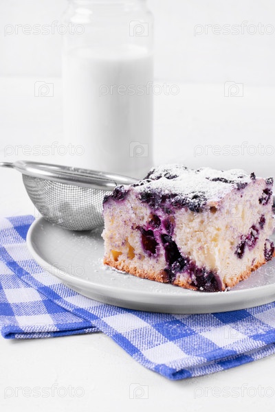 Финский пирог с чернилами (Mustikkapiirakka), посыпанный сахарным порошком на белой тарелке