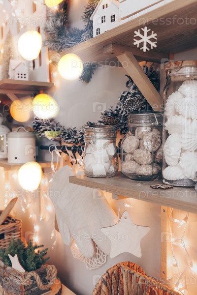 Уютное рождественское фото кондитерской, оформленной в стиле новогодних праздников, стеклянных банок с печеньем