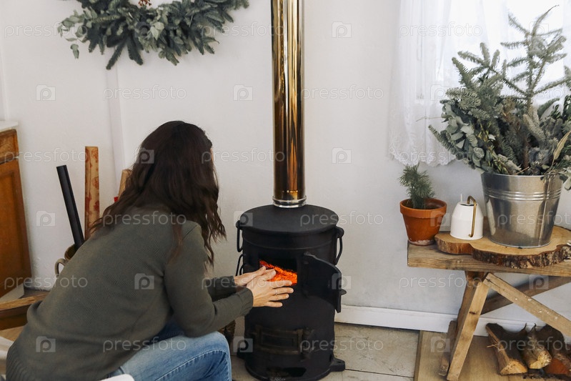 Женщина сидит дома возле буржуйки, греет руки после зимней прогулки в морозную погоду