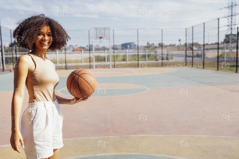 Стильная крутая девушка-подросток собирается на баскетбольной площадке, играет в баскетбол на открытом воздухе