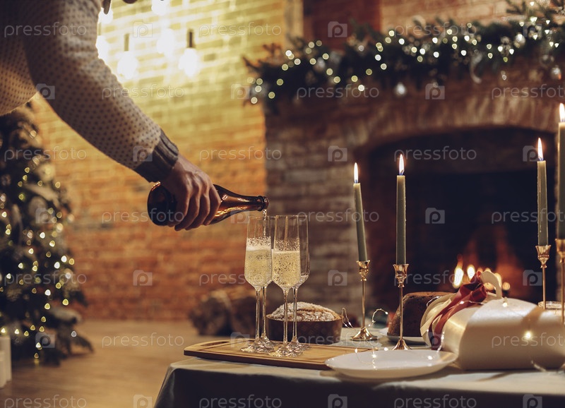 Мужчина наливает шампанское в бокалы, стоящие на столе с праздничным ужином, свечами и новогодними подарками