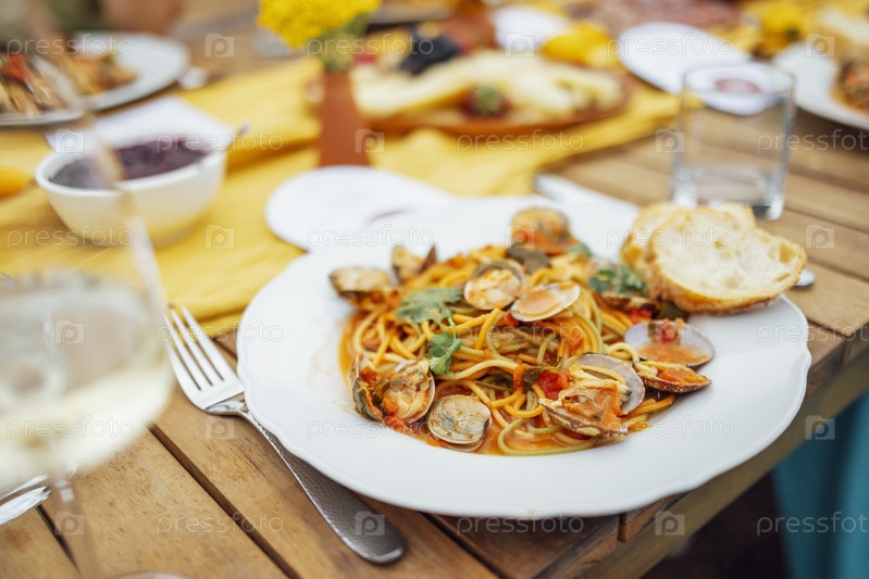 Спагетти из морепродуктов с ракушками, креветками, кальмарами на фоне стола