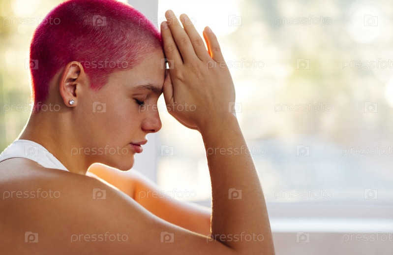 Лысая молодая женщина складывает руки в молитвенной позе у окна