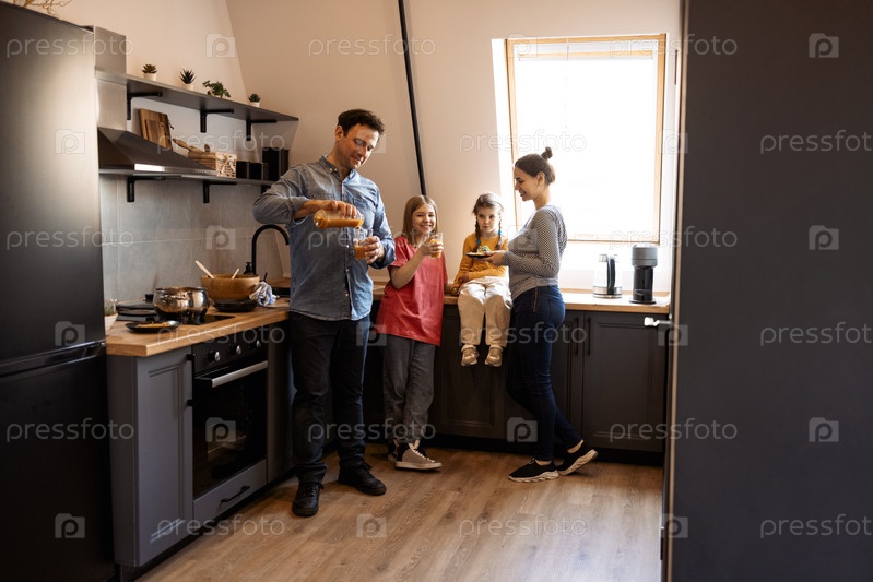 Молодой отец наливает сок своим дочерям. Маленькая дочь держит в руках апельсиновый сок