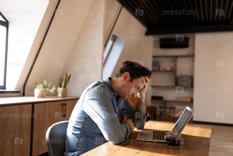 Улыбающийся бородатый кавказский бизнесмен, работающий на ноутбуке в домашнем офисе