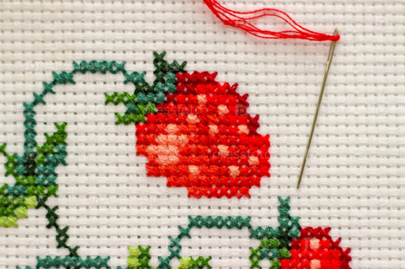 Красная спелая клубника вышита крестиком на белой канве вручную. С иголкой и красной нитью мулине. Крупный план, макрос