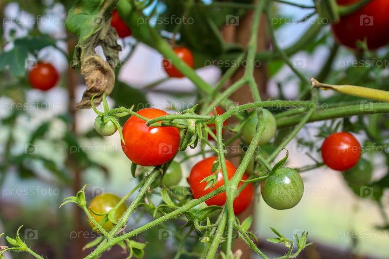 Красные и зеленые помидоры черри на лозе