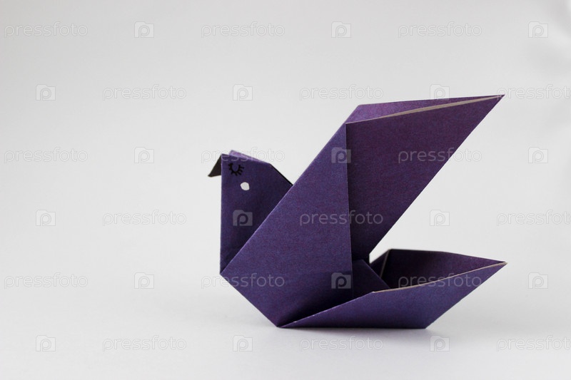 Бумажная фиолетовая птица оригами на белом фоне с копией пространства