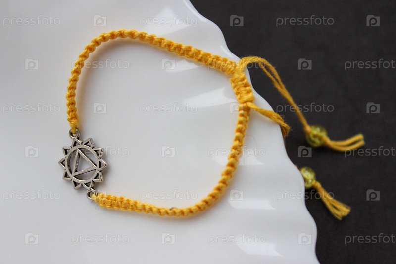 Желтый плетеный браслет ручной работы с манипурой чакры по краю белоснежной тарелки