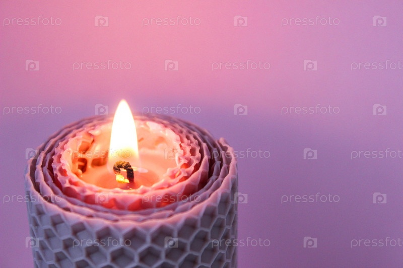 Закройте горящую восковую свечу на розовом фоне. Праздничная рождественская концепция