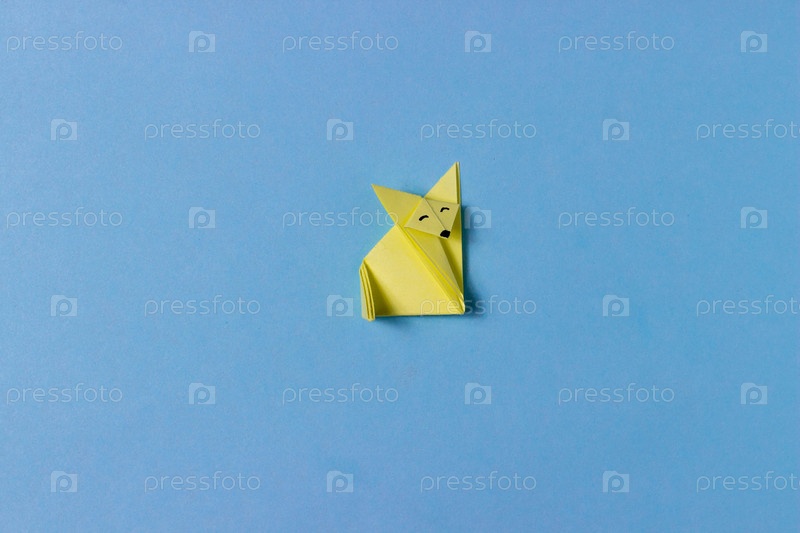 Лиса оригами сложена из желтой бумаги в технике оригами с нарисованными глазками, носиком. В центре синего фона