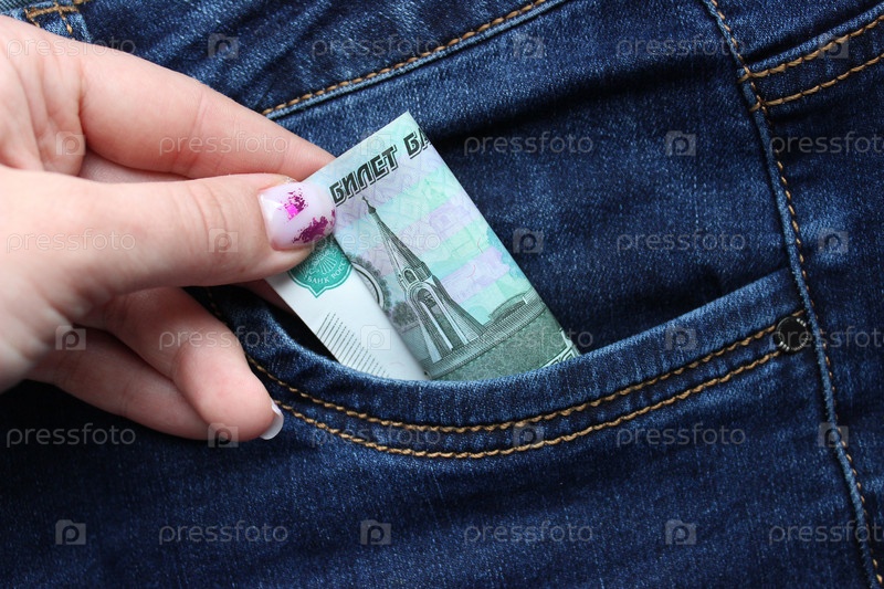 Русские деньги в кармане джинсов. Рука достает из кармана тысячу рублей