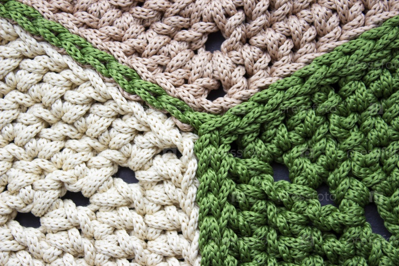Вязание из шнура. Ковер крючком из шестиугольников. Бежевый и зеленый. Текстура вязания