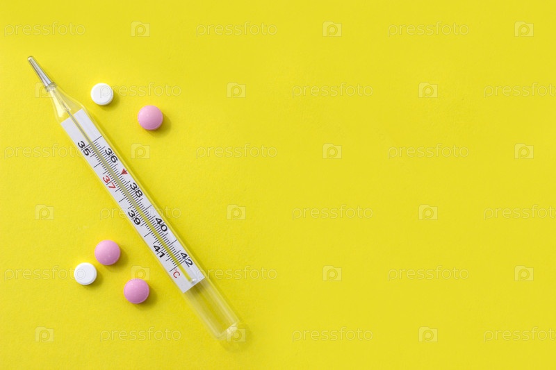Медицинский термометр и таблетки на желтом фоне с местом для вашего дизайна