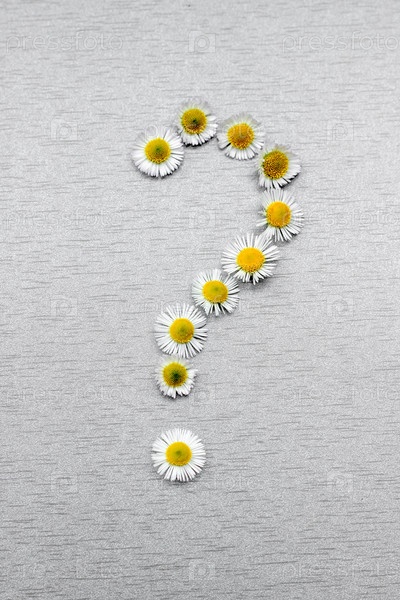Вопросительный знак цветов ромашки на сером фоне. Натуральный, органический. Символ