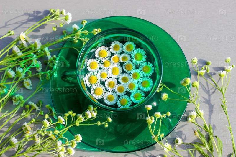 Ромашка в зеленой чашке с блюдцем в окружении цветов под ярким солнечным светом. Лето, тепло. Красивая картина. Травяной напиток