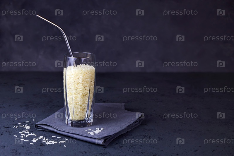 Рис в стакане с металлической трубкой для напитков. Концепция растительного веганского молока