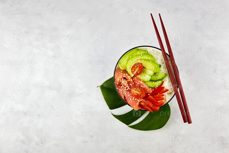 Поке-боул с авокадо, лососем, огурцом, перцем и помидорами черри