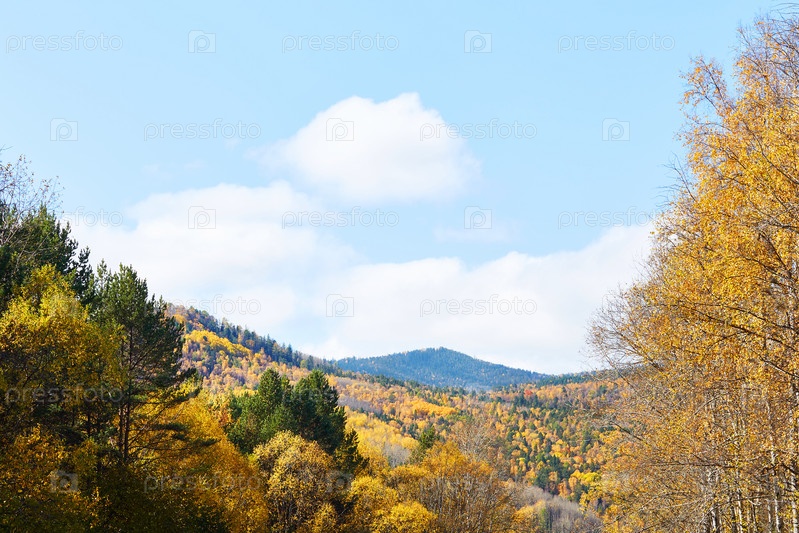 Березы с желтыми листьями, сосны и горы
