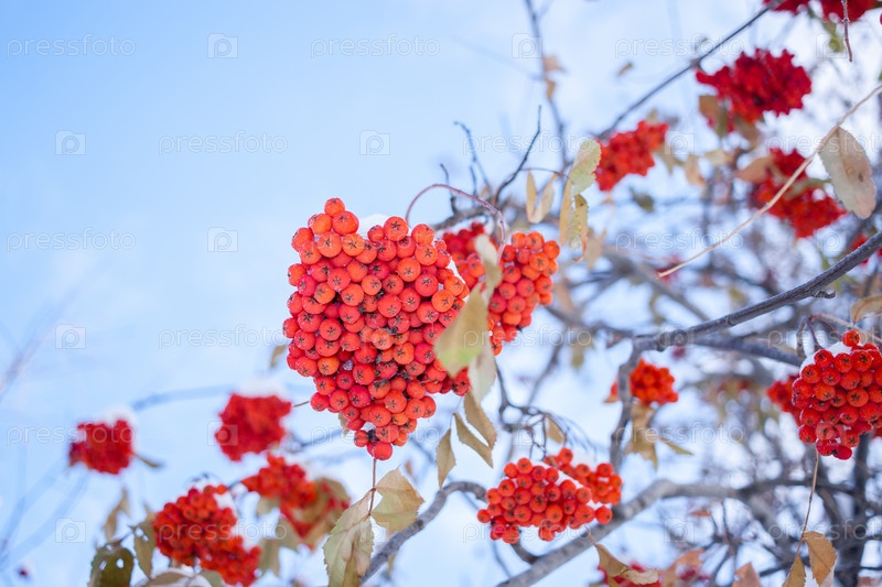 Вид снизу крупным планом на гроздья рябины со спелыми красными ягодами и копировальным пространством
