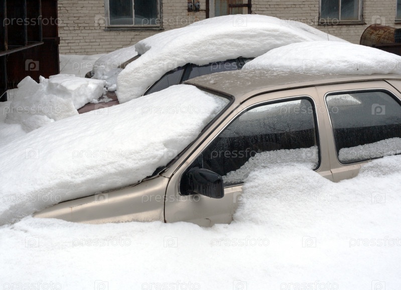 Две машины полностью засыпаны снегом на фоне кирпичной стены