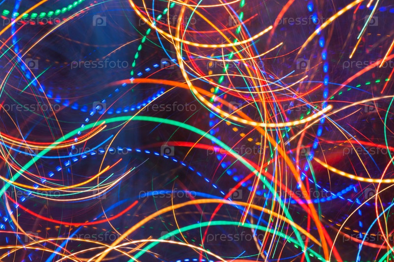 Абстрактный фон. Яркие светящиеся разноцветные волнистые и круглые сплошные и пунктирные линии