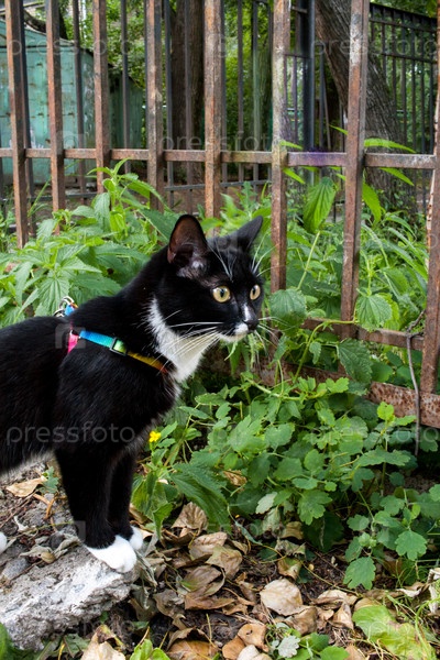 Черно-белый кот ходит на упряжке возле старой ржавой металлической изгороди в летний день