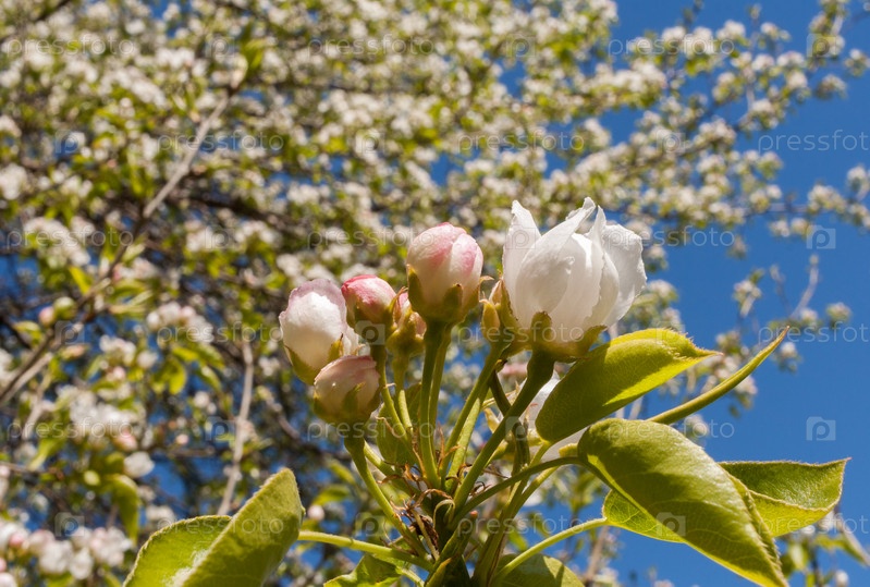 Бутоны крупным планом и раскрывающийся цветок яблони весной
