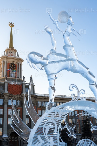 Екатеринбург, Россия - 13 января 2018 г.: Ледяная скульптура футболиста с мячом на фоне ратуши