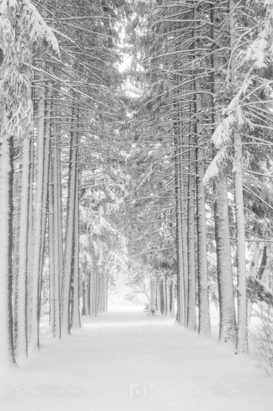Заснеженная аллея высоких елей и елей в городском парке. Черно-белое фото
