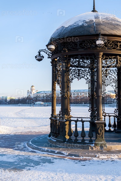 Крупный план кованой беседки на набережной замерзшего городского пруда в центре Екатеринбурга в зимний морозный день