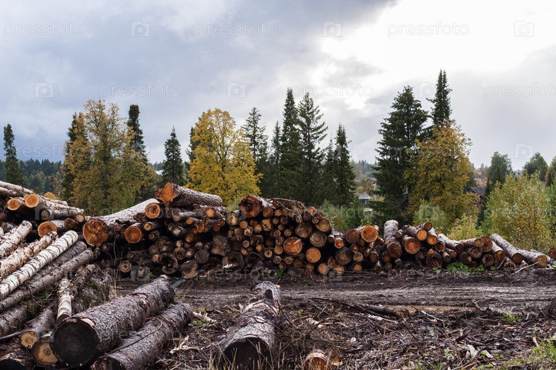 Склад срубленных деревьев на переднем плане и живые деревья на заднем