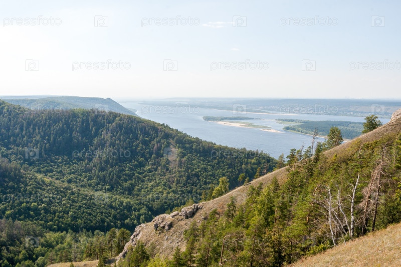 Вид на русло Волги и лесистые Жигулевские горы с вершины горы Стрельной