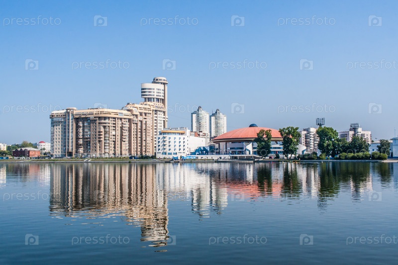 Екатеринбург, Россия - 04 августа 2016 г.: Набережная городского пруда в центре Екатеринбурга летним утром