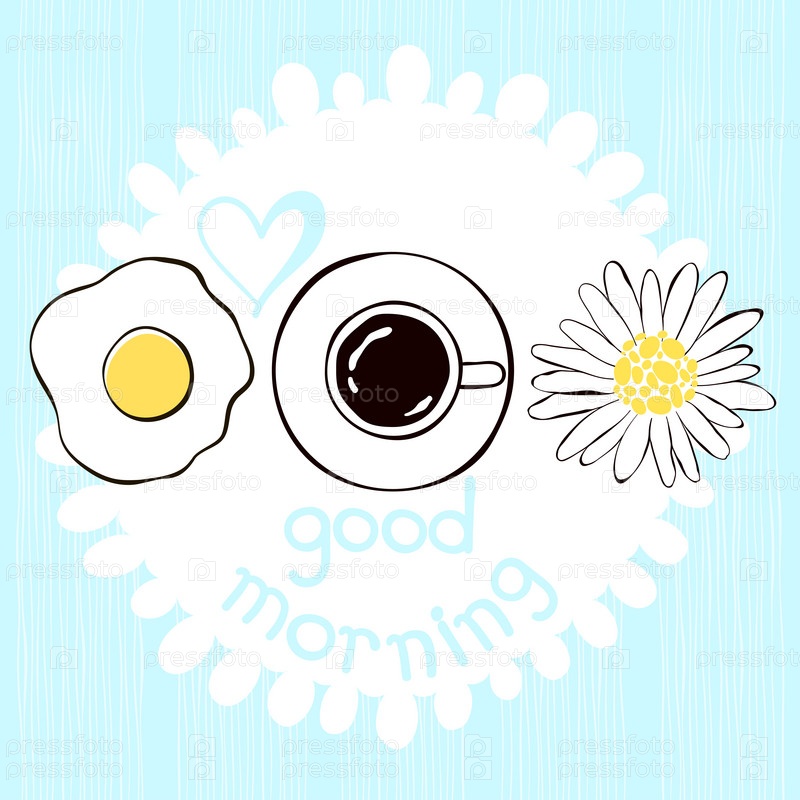 Доброе утро! Ручная рисованная векторная иллюстрация кофе, яичницы и ромашки