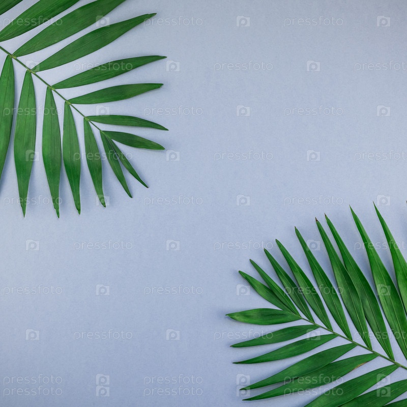 Тропические пальмовые листья на синем фоне серой бумаги