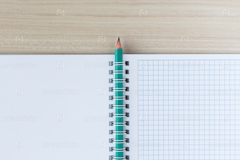 Карандаш, вставленный в спиральный зажим блокнота, на деревянном столе. Вид сверху