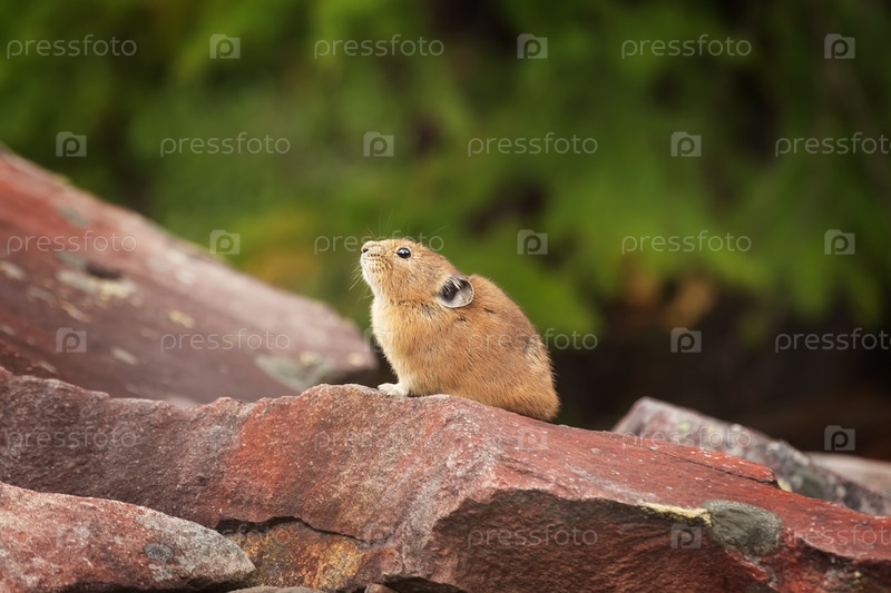 Рыжая пищуха сидит на камнях, глядя вверх