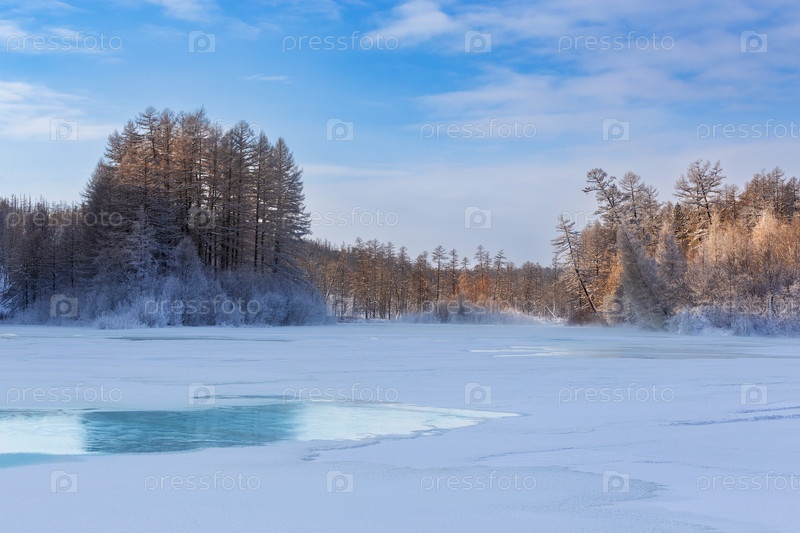 Зимний пейзаж утром на реке с бирюзовым льдом. Устье реки Беркакит в Южной Якутии, Россия