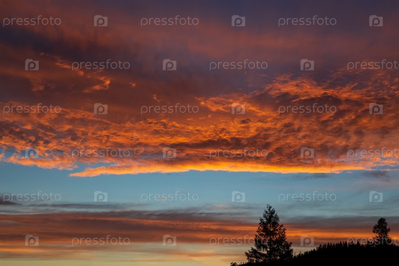 Вечерний пейзаж с драматическим закатом и силуэтами деревьев на фоне неба
