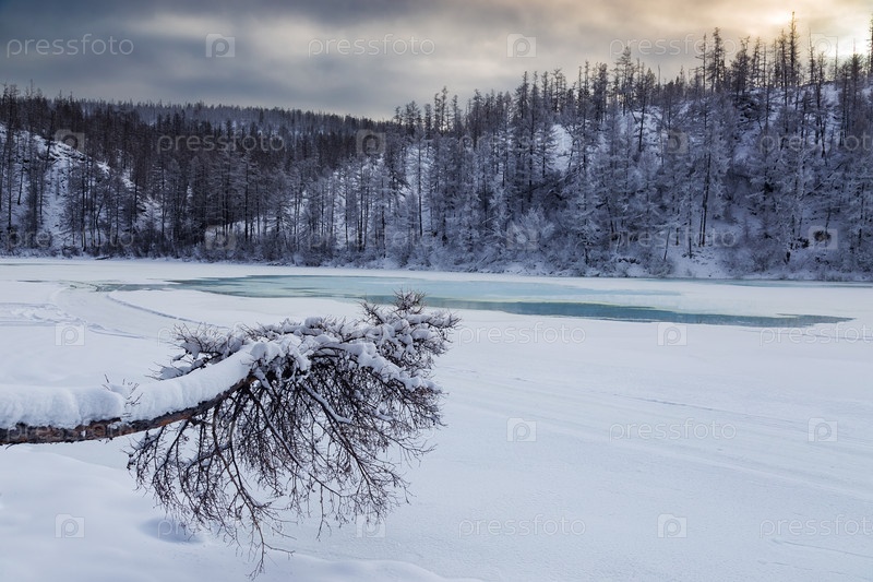 Пасмурная погода в январе на реке с бирюзовым льдом в Якутии