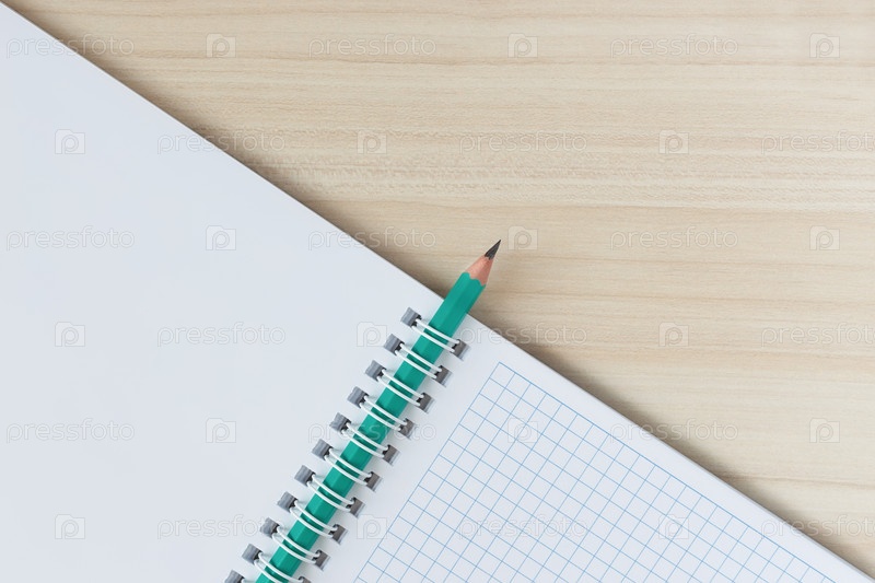 Карандаш, вставленный в спиральный зажим блокнота, на деревянном столе, по диагонали. Вид сверху
