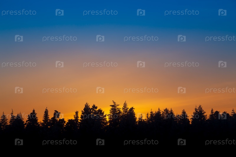 Оранжево-голубое небо во время заката с силуэтами деревьев. Вечерний пейзаж с удивительными красками