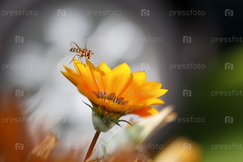 Журчак сидит на краю желтого цветка. Размытый фон. макросъемка