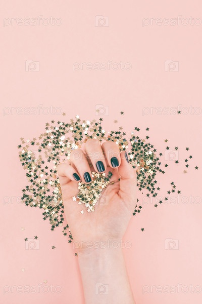 Женские руки покрыли конфетти золотыми звездами на розовом