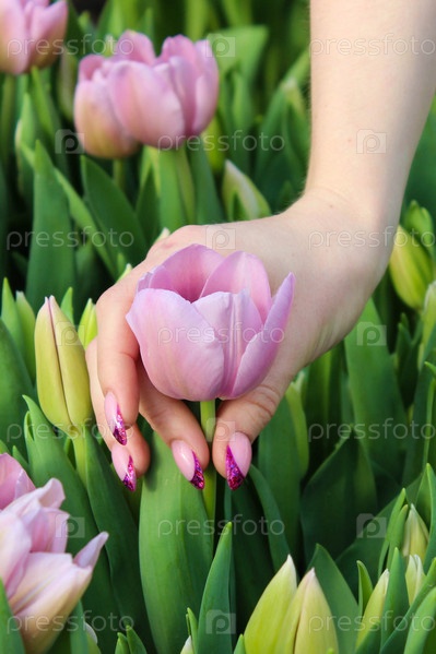 Женская рука с красивым маникюром рвет розовый тюльпан, растущий среди других цветов. Вертикальное фото