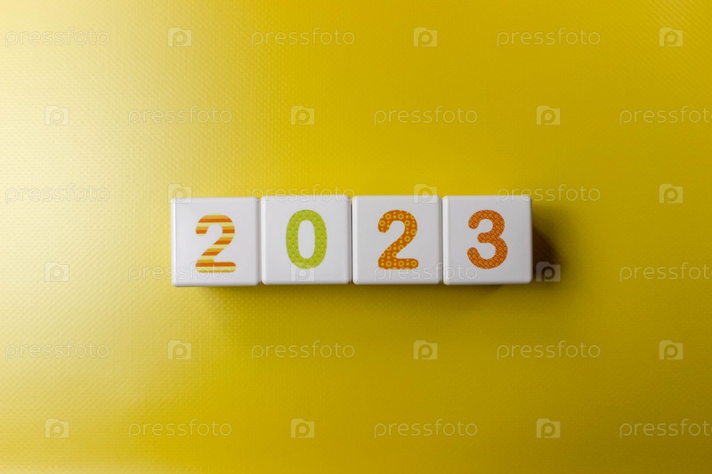 Кубики с красочными цифрами 2023 на желтом фоне. Новый год, календарь